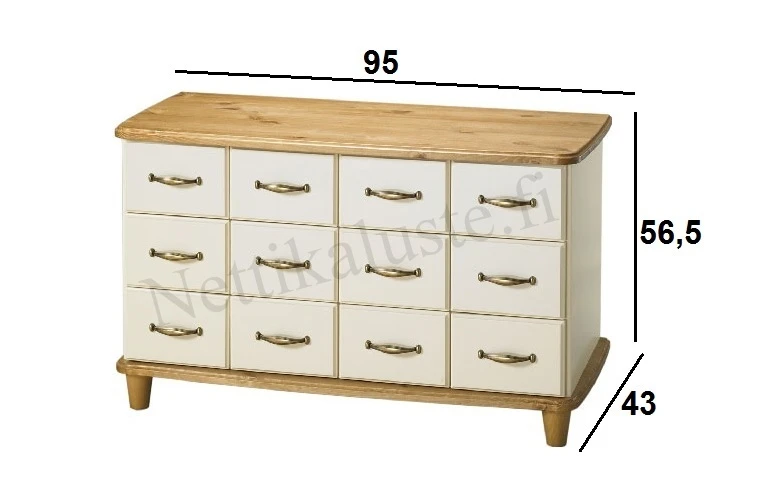 Aino apteekkarin lipastossa on 12 pientä laatikkoa, varustettuna metallisilla liukukiskoilla.