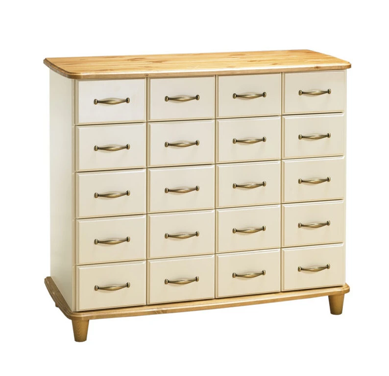 Aino apteekkarin lipastossa on 20 pientä laatikkoa metallisilla kiskoilla varustettuna.Â