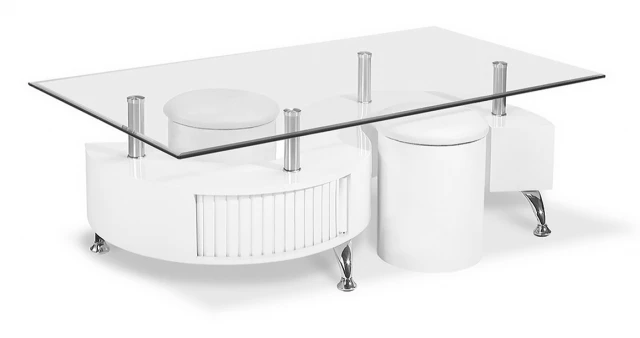 Cubio-sohvapöytään kuuluu kaksi pientä, pyöreää rahia, joita voi säilyttää pöydän alla. Sohvapöydässä on kirkas lasikansi. Pöydän vaaleat osat ovat valkoista, korkeakiiltoista MDF-levyä, jalat ja kiinnikkeet kromattua metallia. Rahit ovat mdf-levyä, ja niiden kannet on verhoiltu valkoisella polyuretaanilla.