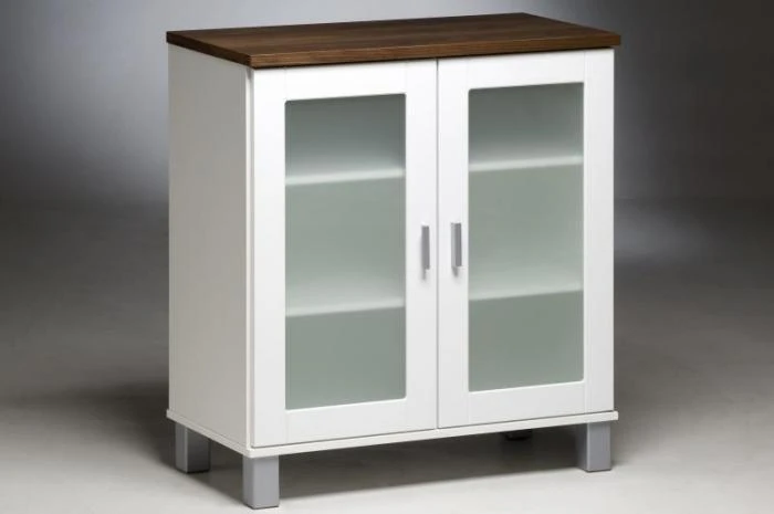 Korkealaatuisen Fondi-tuotesarjan lasiovilipasto kahdella lasiovella ja yhdellä korkeussäädettävällä välihyllyllä.