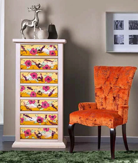 Italialaisen La Casa-tuotesarjan värikäs kapea lipasto kauniilla kuvioiduilla vetolaatikoilla. Kauniissa lipastossa on yhteensä 7 vetolaatikkoa.