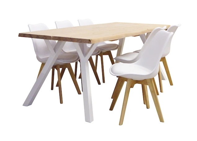 Suosittu Lana-ruokapöytä harjatulla massiivipuukannella. Pöytään voi yhdistellä monenlaisia tuoleja.