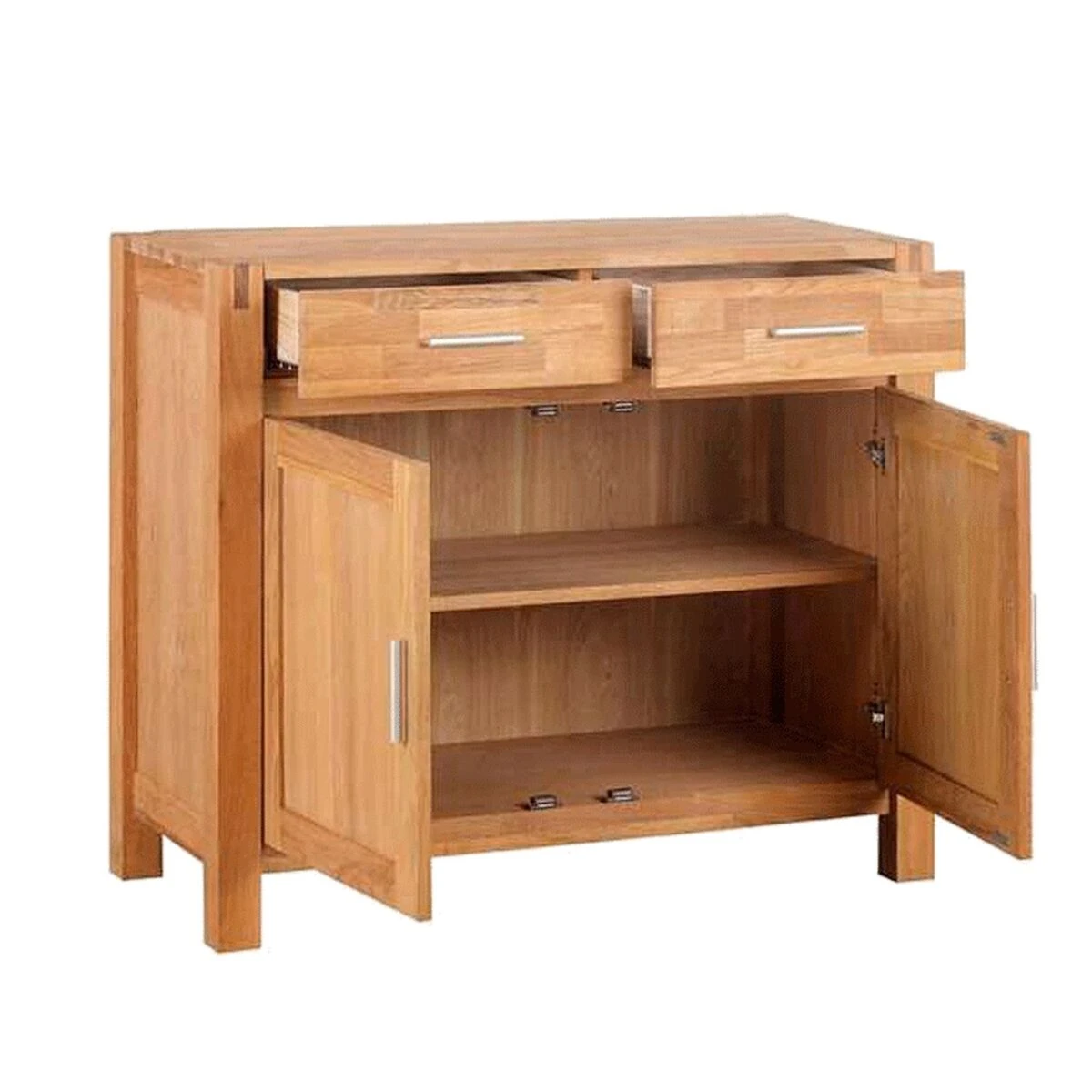 Trendikäs tammiviilutettu lipasto kahdella ovella ja kahdella vetolaatikolla.