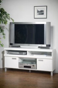 Tv-tason avo-osassa on lasihylly sekä reunoilla umpiovet. Saatavana kahdessa eri värivaihtoehdossa. Lisävarusteena saatavana tv-koroke (katso lisäkuva) leveys 119 cm, syvyys 41 cm, korkeus 16 cm. Koroke toimitetaan osina paketissa.