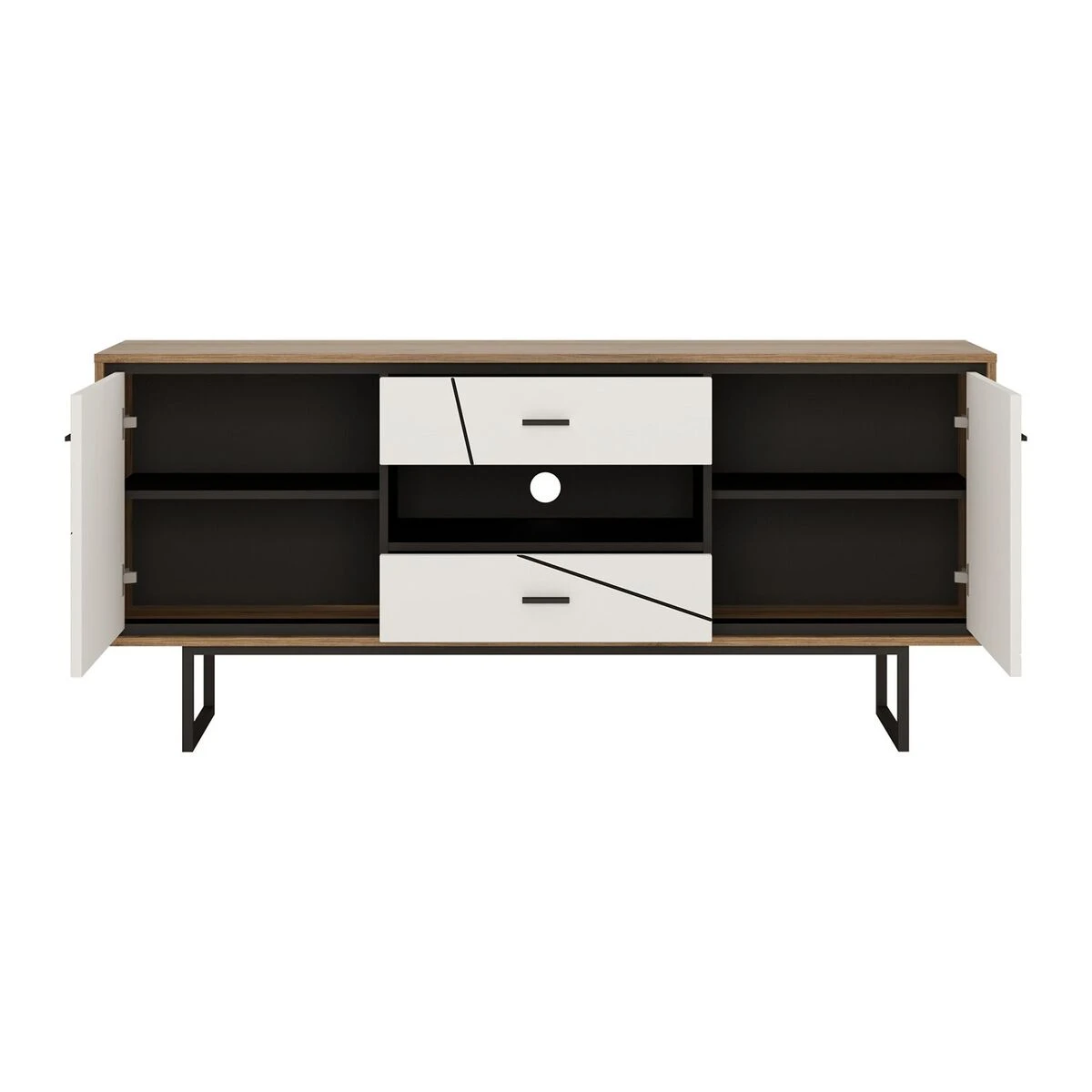 - Tv-tasossa 2 ovikaappia välihyllyillä, 2 vetolaatikkoa sekä avotaso