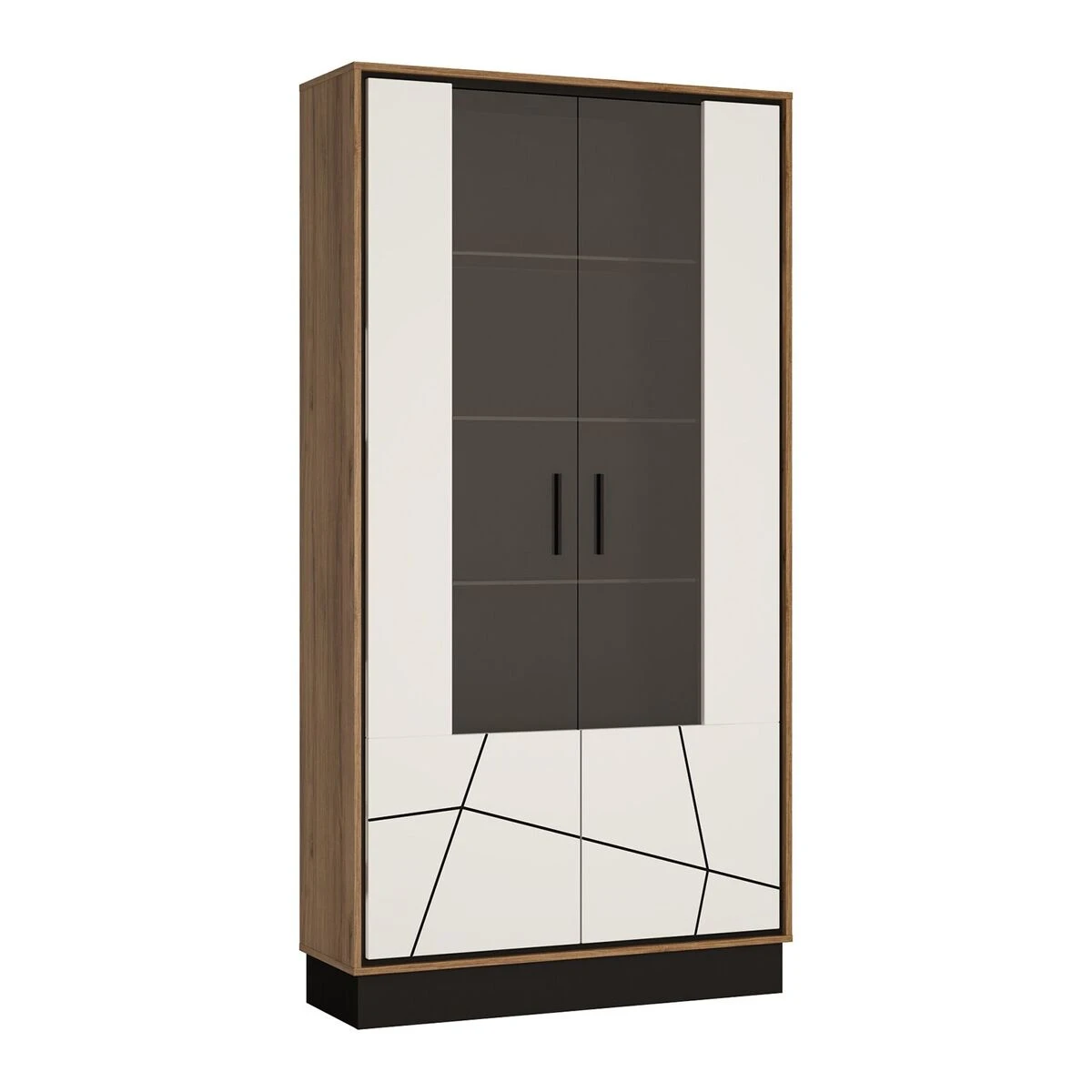 Huipputyylikäs Palermo tuotesarjan vitriini kahdella lasiovella ja lasihyllyillä. Tuotesarjaa koristaa kauniit abstaktit koristekuvioinnit.