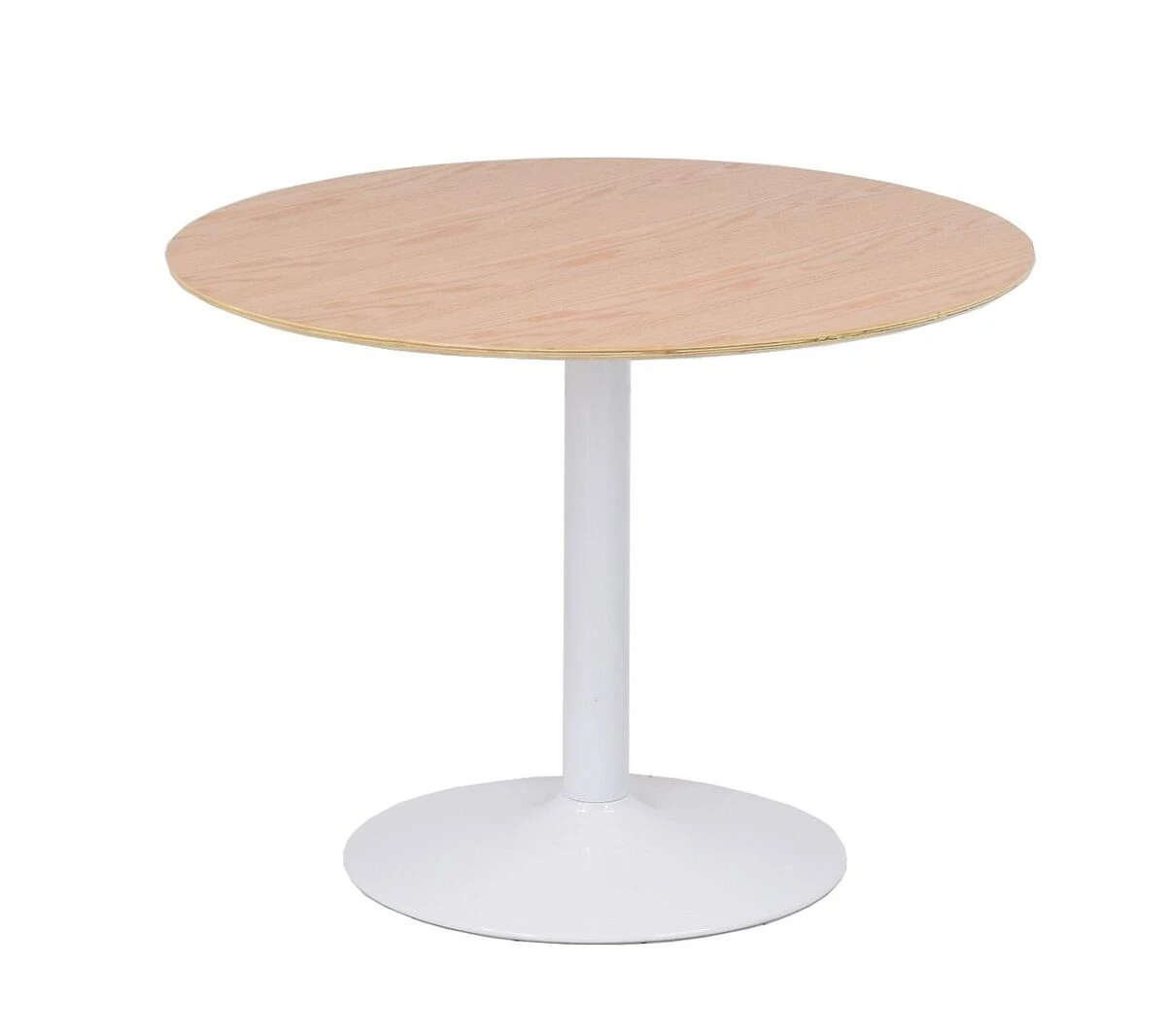 Pyöreän muotonsa ansiosta ruokapöytä sopii monenlaisiin tiloihin, myös pieniinkin, ja sen ympärille mahtuu mukavasti neljä tuolia.
