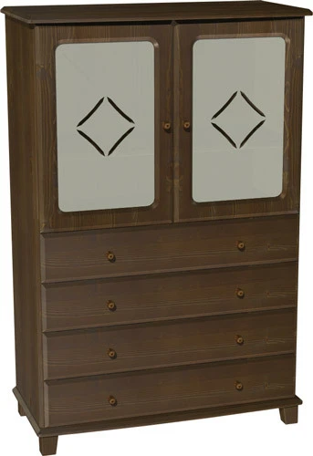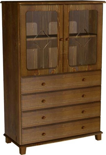 Massiivimäntyä, laatikoiden vetimet ja liukukiskot metalliset. Saatavana joko kirkkailla tai etsatuilla lasiovilla.