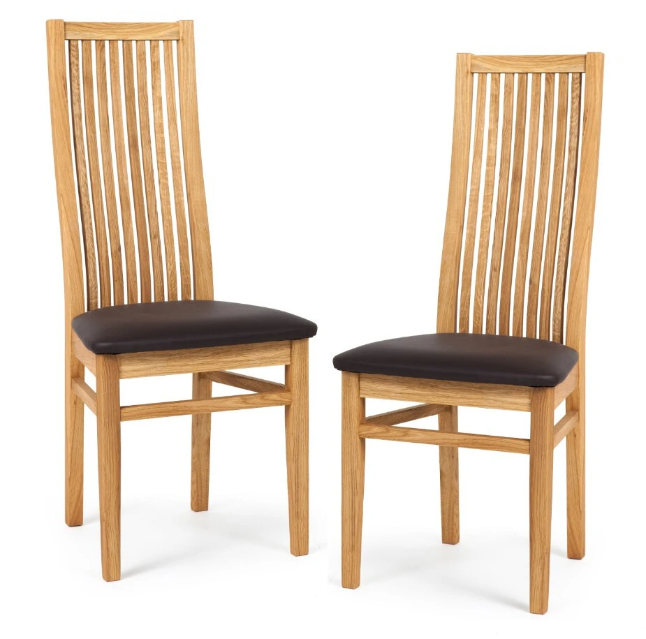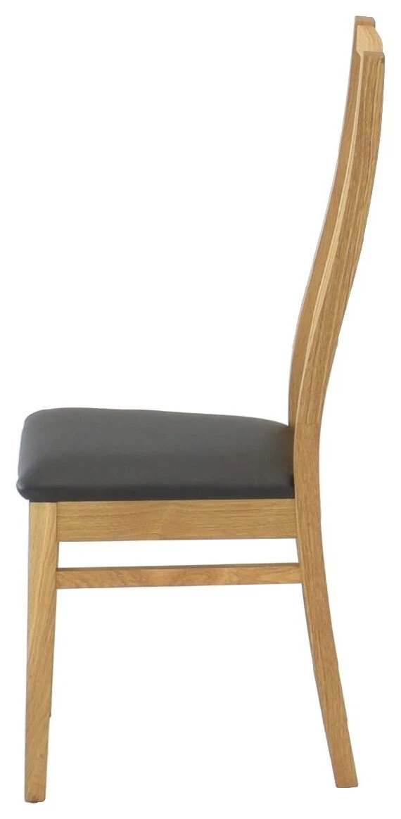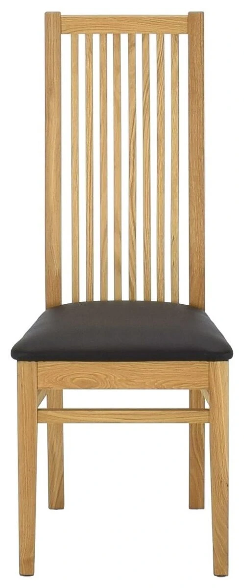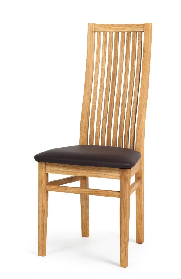 Modernisti ajaton Sandra ruokatuoli on valmistettu massiivitammesta. Selkänoja kaareutuu kauniisti ja antaa hyvän tuen koko selälle. Tuolin pinta on viimeistelty puolikiiltävällä lakalla. Istuimessa on pehmustettu, keinonahkaverhoiltu istuin.