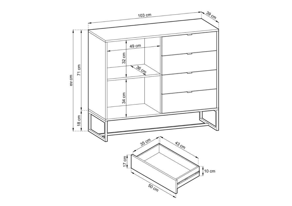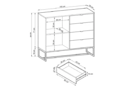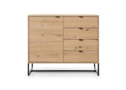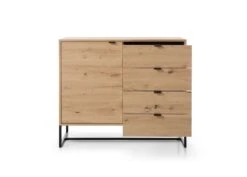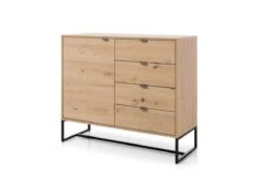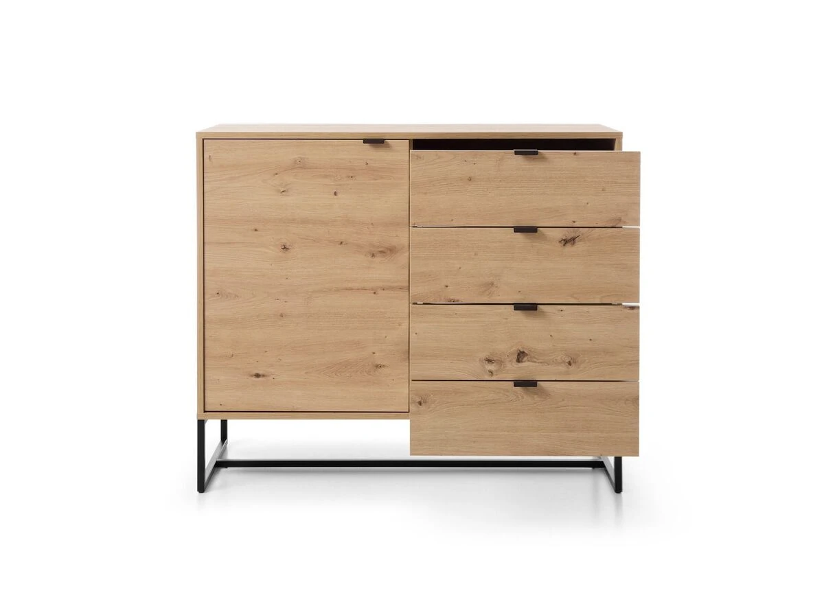 Tyylikäs tammen värinen Fore-senkki. Senkissä on 16 mm laminoitu kalustelevyrunko, ABS-reunanauha, mustat metallijalat sekä mustat metallivetimet. Senkki sisältää yhden kaapin välihyllyllä sekä neljä vetolaatikkoa.