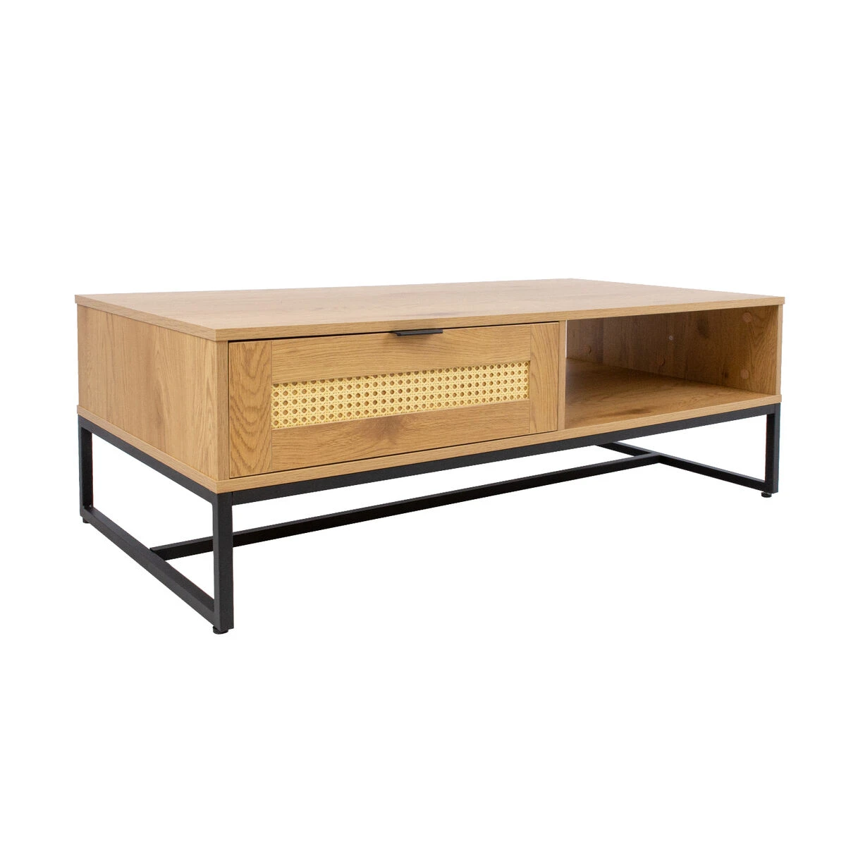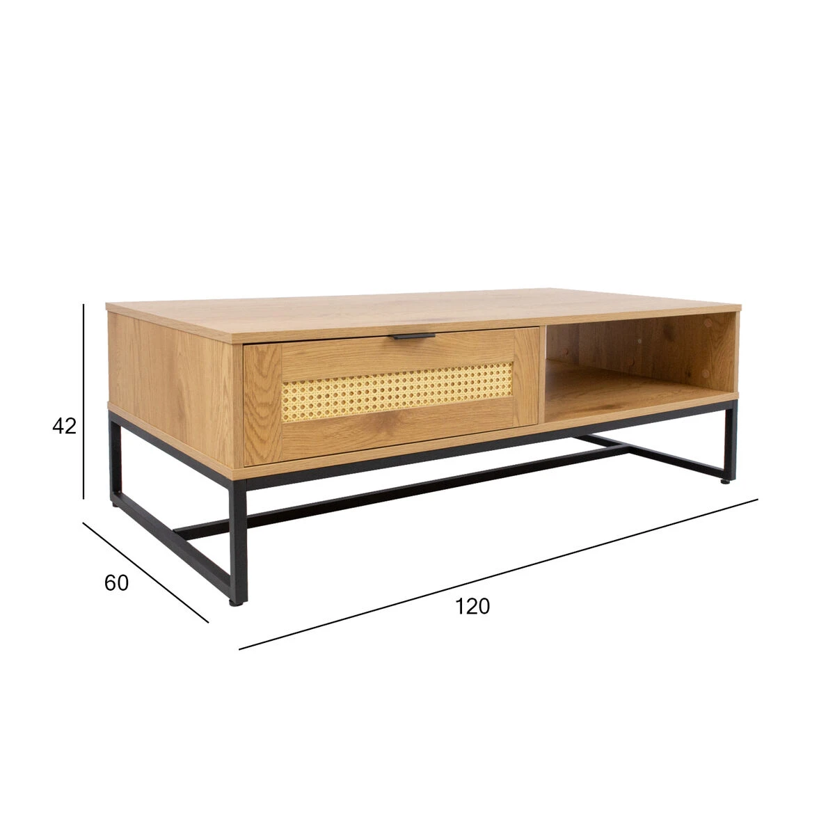 - Pöydässä molemmilta puolilta avattava vetolaatikko kauniilla rottinkikuvioidulla muovipaneelilla