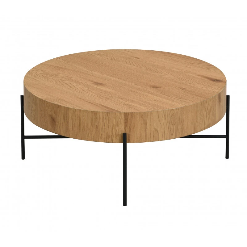 Moderni Pigeon sohvapöytä paksulla, pyöreällä kansiosalla sekä siroilla metallijaloilla.