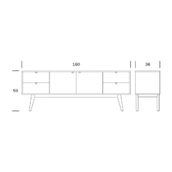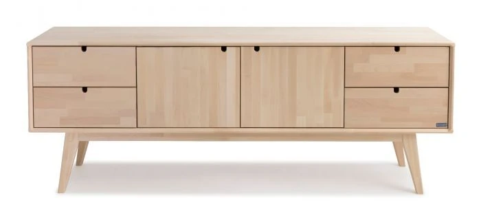 Kevyt ja kaunis, kotimainen kokokoivuinen tv-taso kahdella ovikaapilla ja neljällä vetolaatikolla.