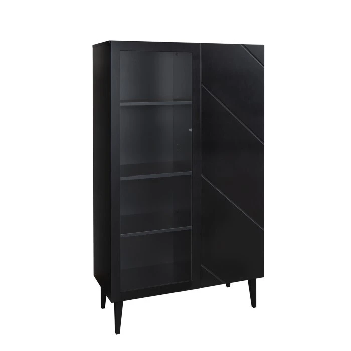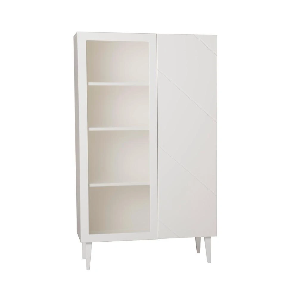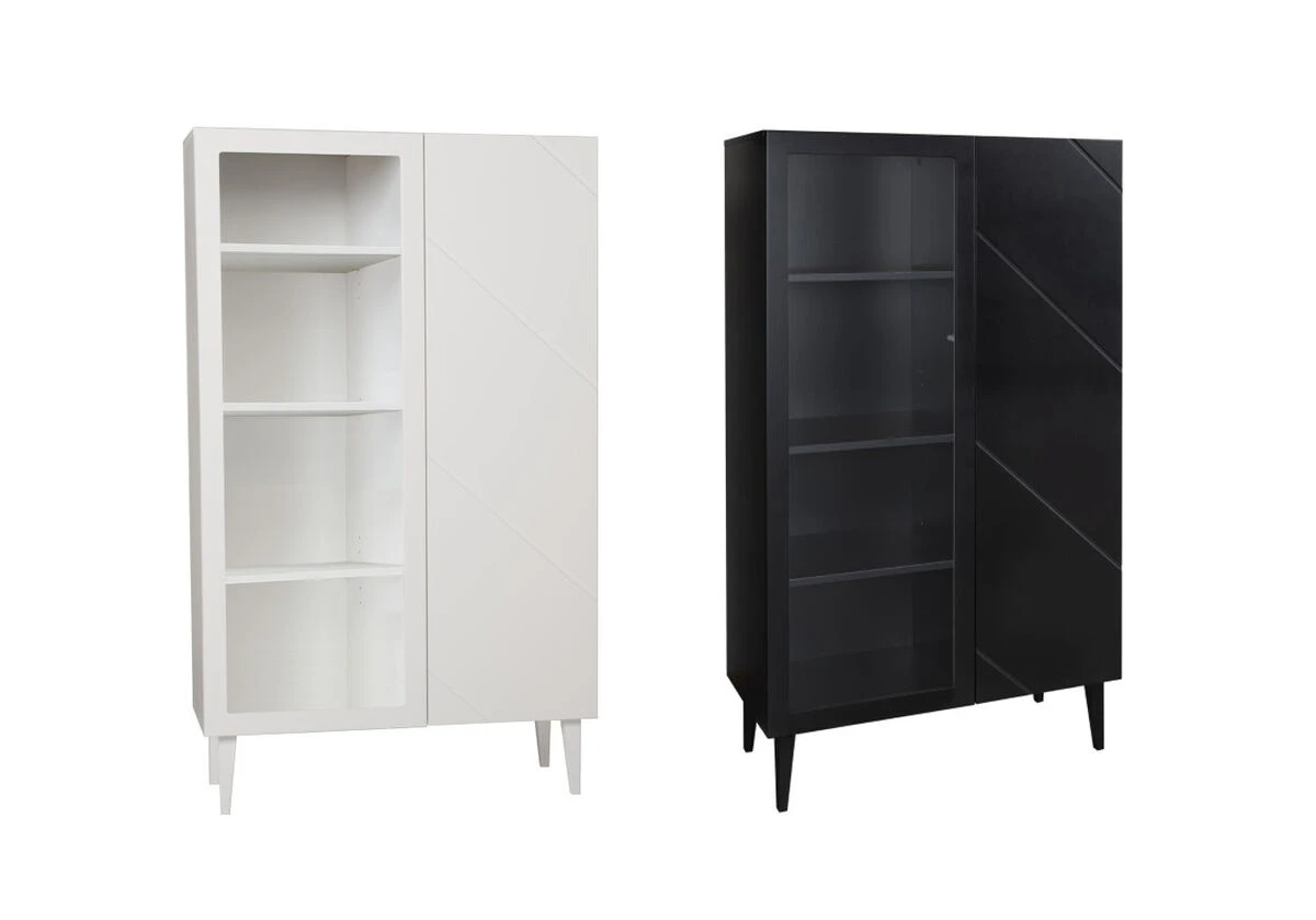90 cm leveässä Vilja vitriinissä on yksi lasiovi ja yksi umpiovi. Ovissa on kätevät push to open-mekanismit. Voit valita lasioven kirkkaalla tai maitolasilla. Molempien ovien takana on 3 kpl korkeussäädettäviä hyllyjä.