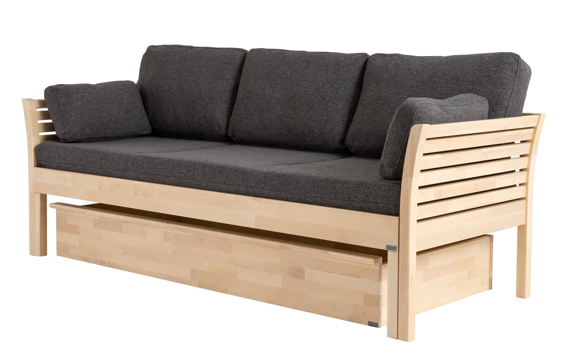 Tarkalla käsityöllä ja uusimmalla tekniikalla valmistettava kotimainen Kanerva laverisohva on turvallinen valinta kotiin, mökille ja myös julkitilakalusteeksi. Vuodevaatelaatikko ja patjasarja myydään erikseen.