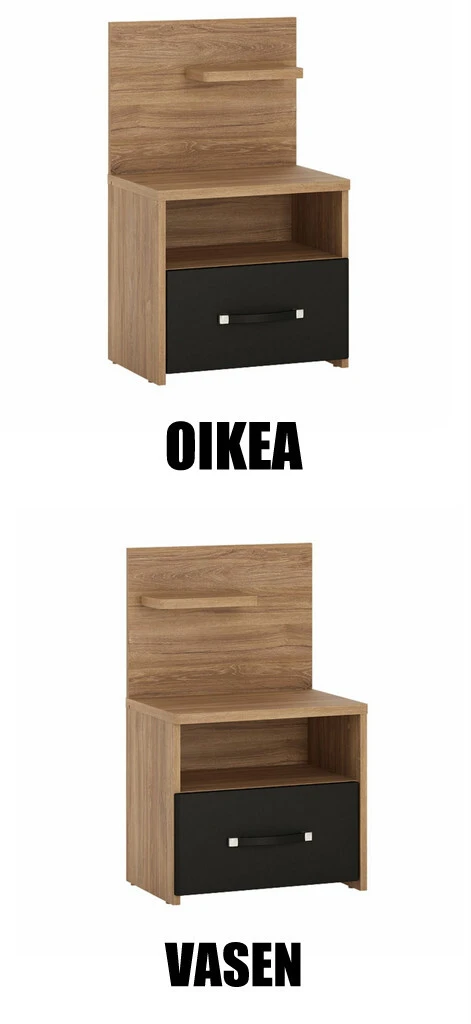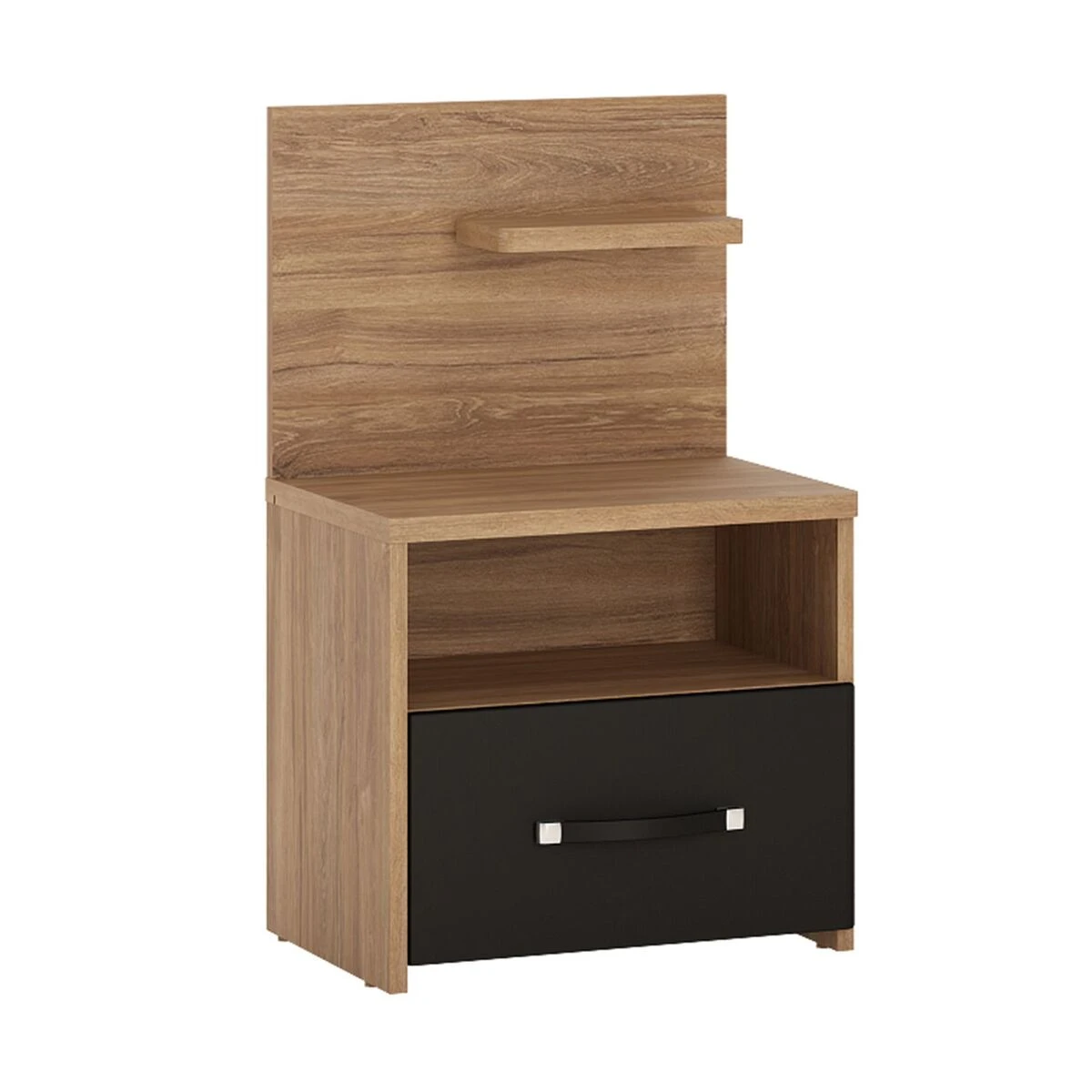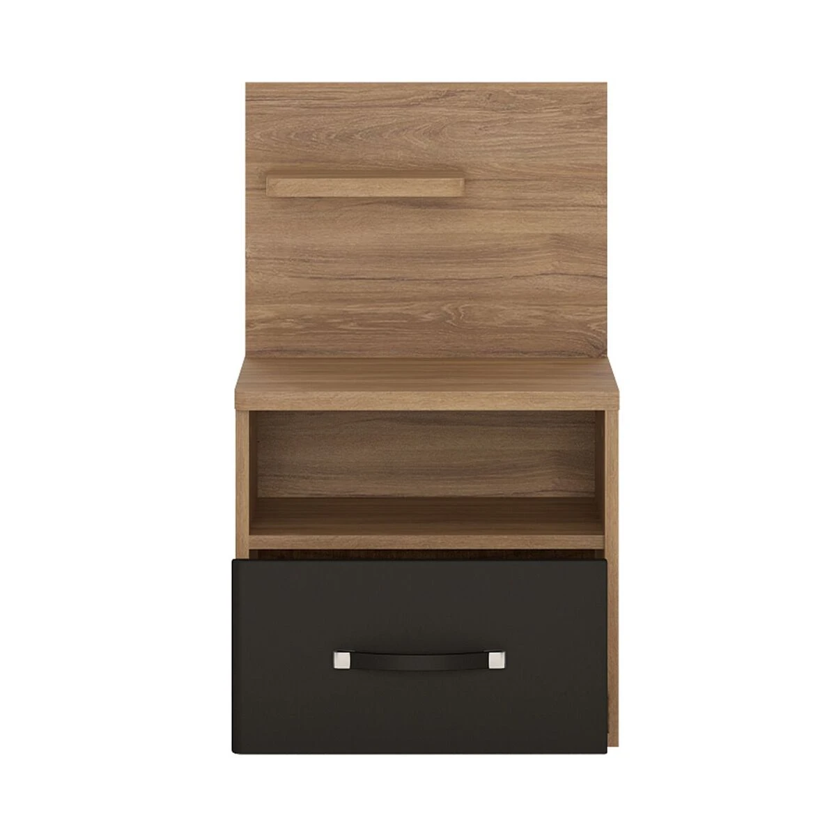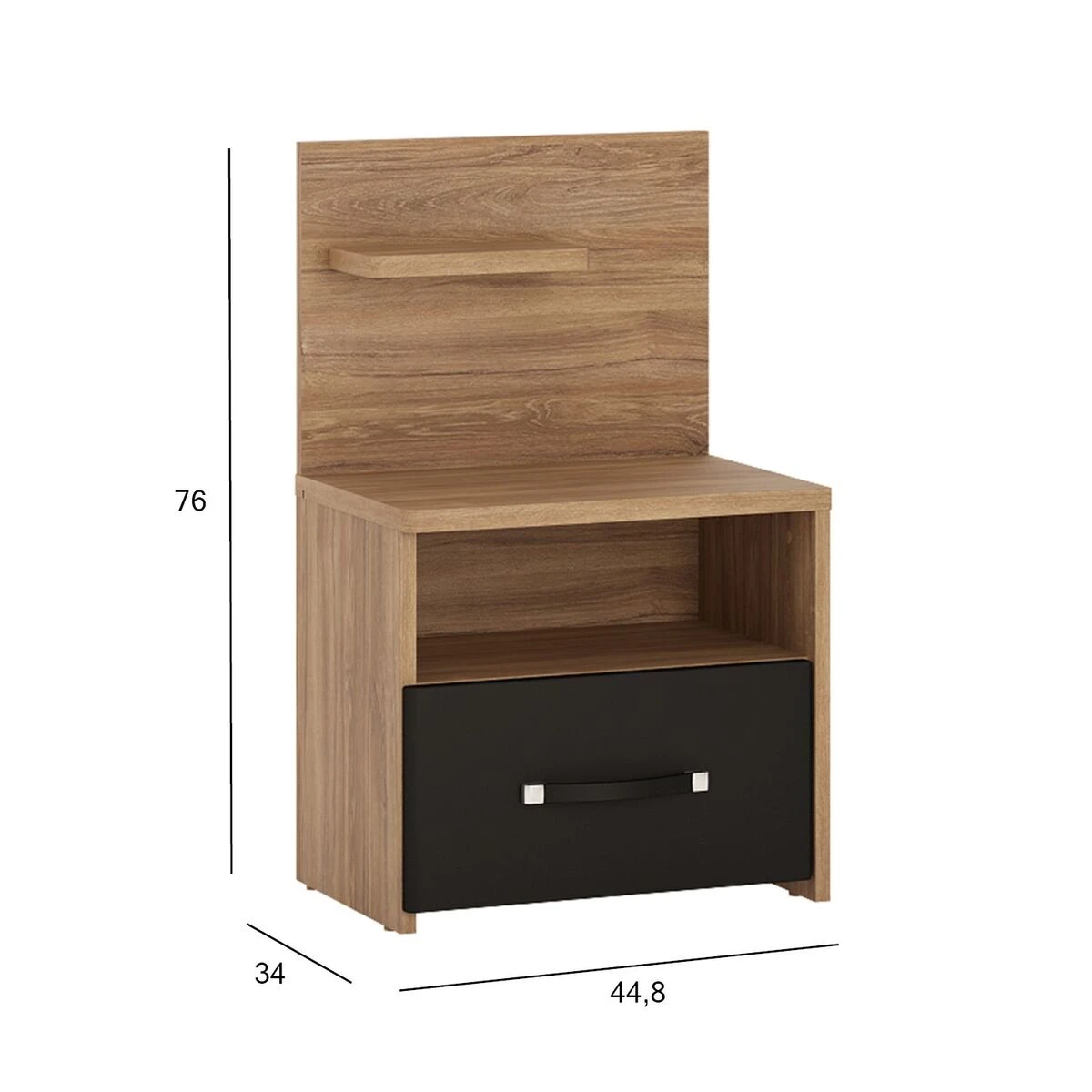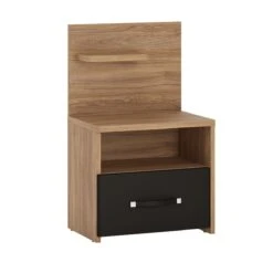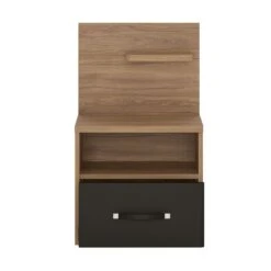 Nizza yöpöytä on tyylikäs yhdistelmä mustaa ja puuta. Yöpöydässä on pieni hylly, avohylly ja tilava laatikko.